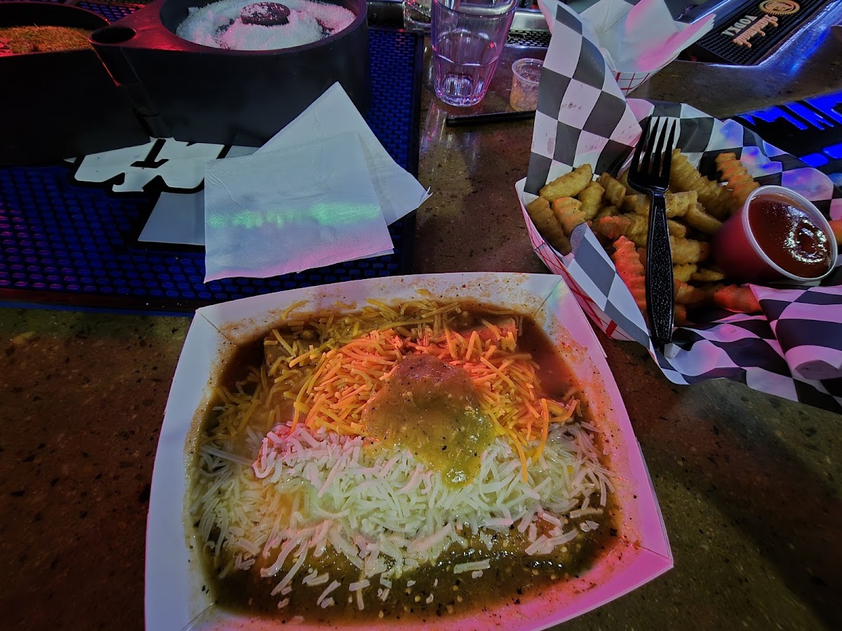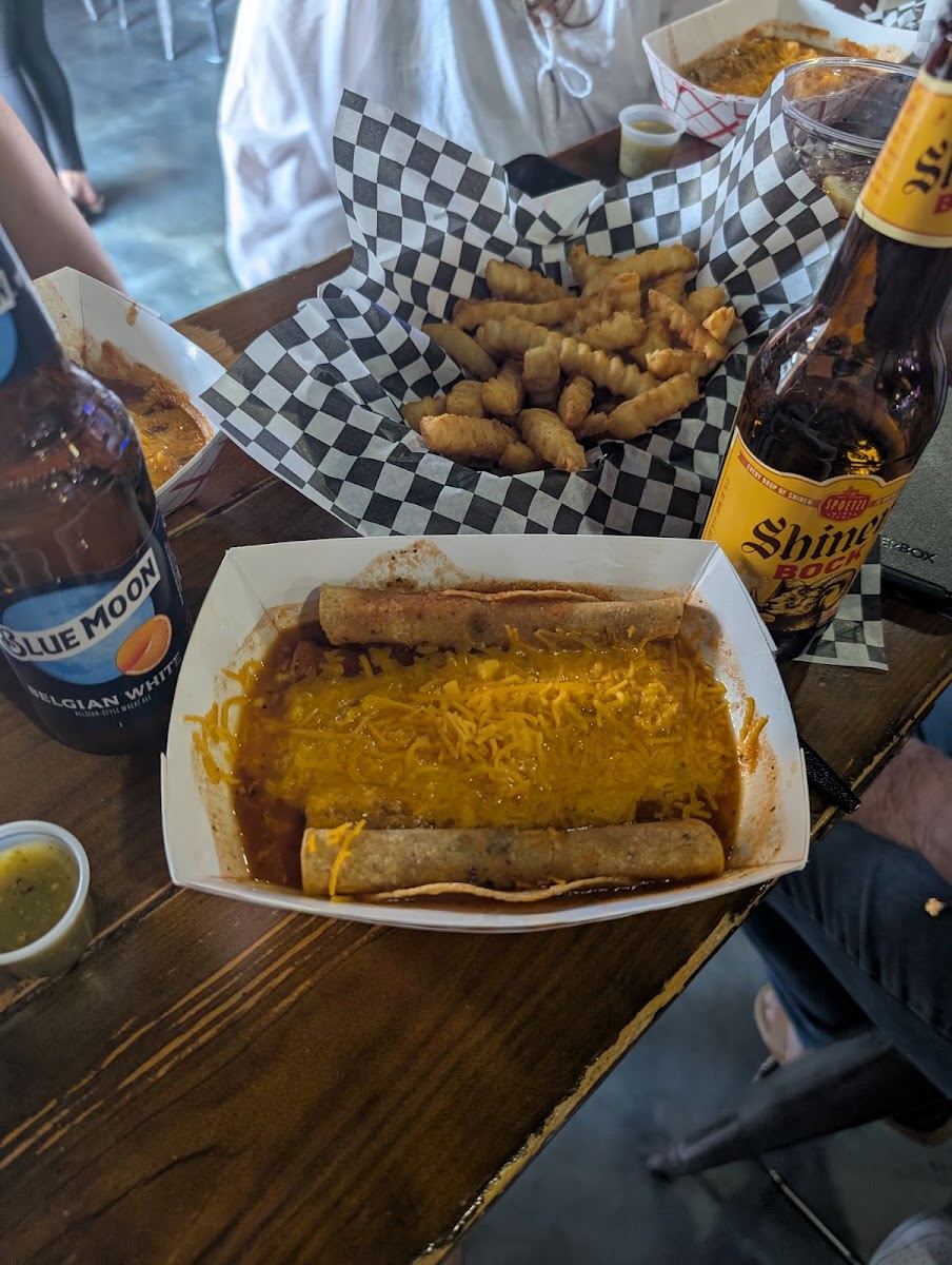 Good music. Fast service. Wide array of drinks. The onion rings were huge. They have rolled tacos like a staple spot in El Paso. The sauce is thicker and the salsa is spicy. I recommend this place for the eats and drinks.